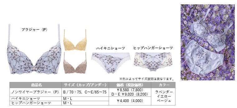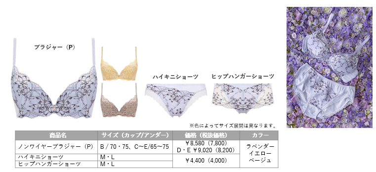 ブラジャーには、ノンワイヤータイプ(P)がエントリー。柔らかな着けごこちながら、カップサイドの「ハリ感メイクシートⓇ」でバストをすくい上げ、 3Dソフトパッドで、ふっくらハリ感のあるデコルテに。ワイヤーなしでも、フロラーレらしい上品で美しいバストシルエットが叶います。