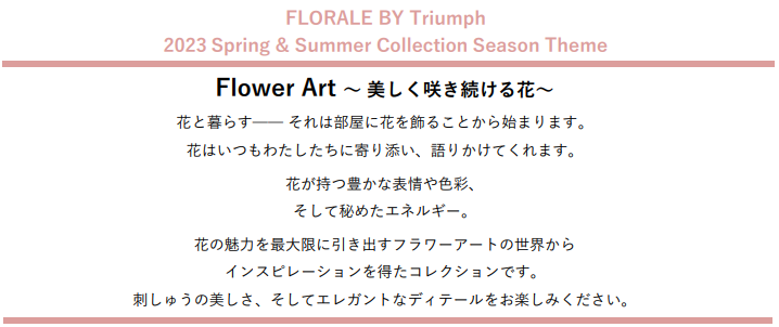 2016年、日本でデビュー。「FLORALE BY Triumph(フロラーレ バイ トリンプ)」は、大人の女性のボ ディのために誕生したプレミアムブランドです。バストをやわらかく包みこむソフトコンフォート素材、快 適でなめらかな背中のラインを描くバックパネル、極細でしなやかな撚りをかけた綿糸を独自開発するなど、 身に着ける時に出会う“着けごこちのやさしさ”を第一に。さらに、体形の変化を捉え女性らしいラインを実 現。繊細に描く刺繍、上質なレースにもこだわり、デザインでもマチュアな美しさを引き出します。