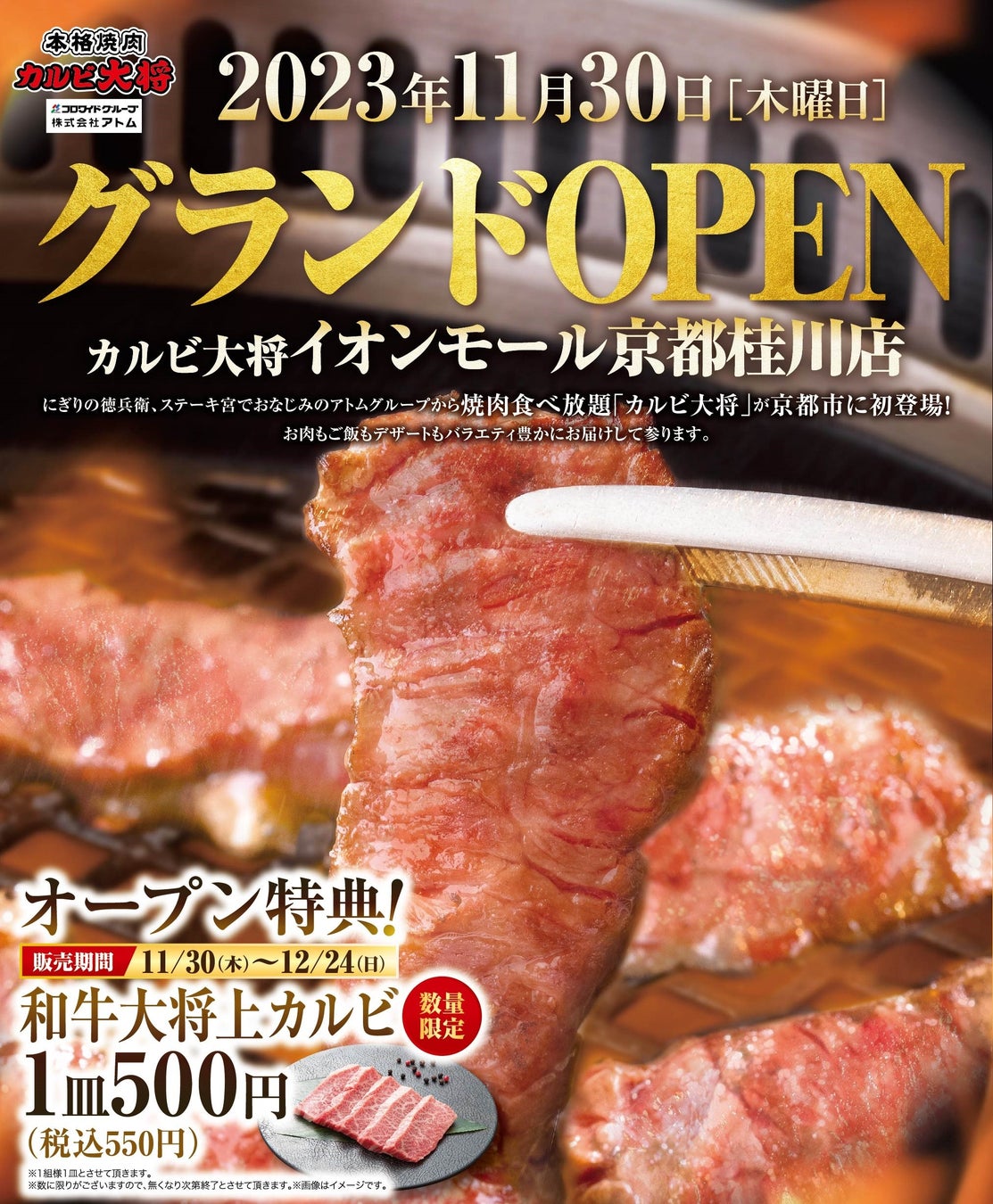 11 月30 日(木)京都府京都市に初出店。本格焼肉『 カルビ大将イオン京都桂川店』 新規オープン。焼肉食べ放題2,780 円(税込3,058 円)より