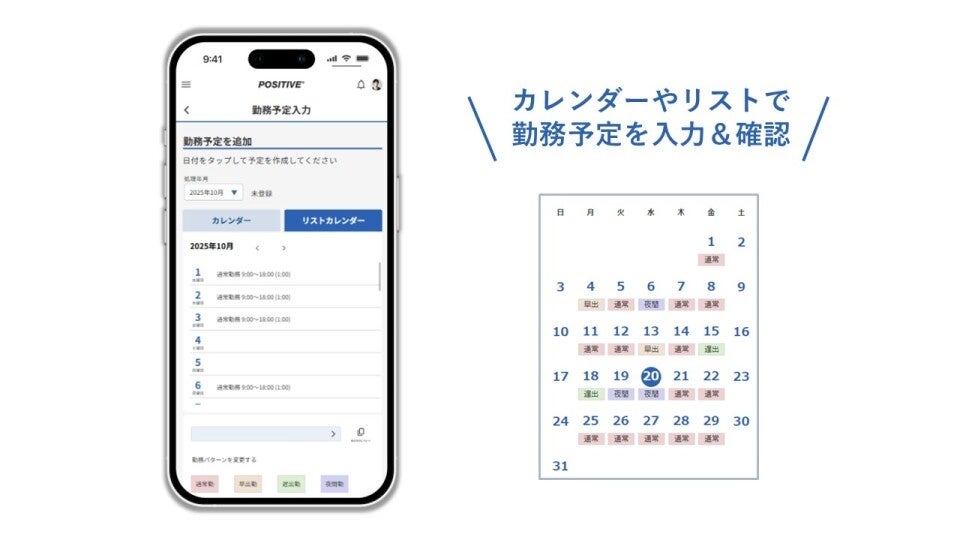 カレンダー形式およびリスト形式の表示に対応し、詳細な勤務予定の入力や照会がスマートデバイス上で可能となりました。外出先でも簡単かつ柔軟にスケジュール管理が行えます。