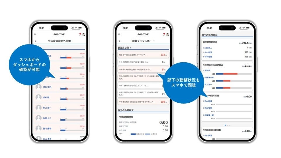 「POSITIVE Ver.7.1」と同様に、スマートデバイス上でも就業ダッシュボードの参照が可能となりました。ユーザー自身の勤務状況に加え、管理者は部下の勤務状況も一覧で確認でき、現場での労務管理における迅速な意思決定を支援します。