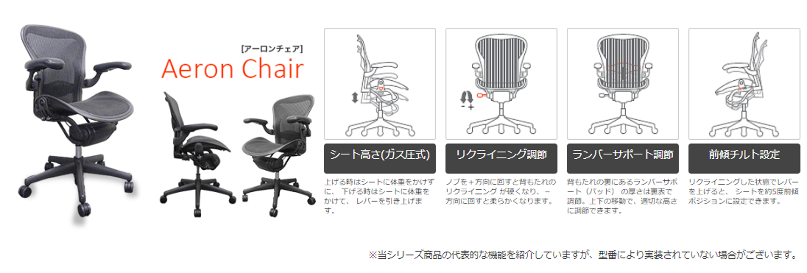 今回入荷分「アーロンチェア」の仕様概要 人気のBサイズをオプションと張地で選べます。