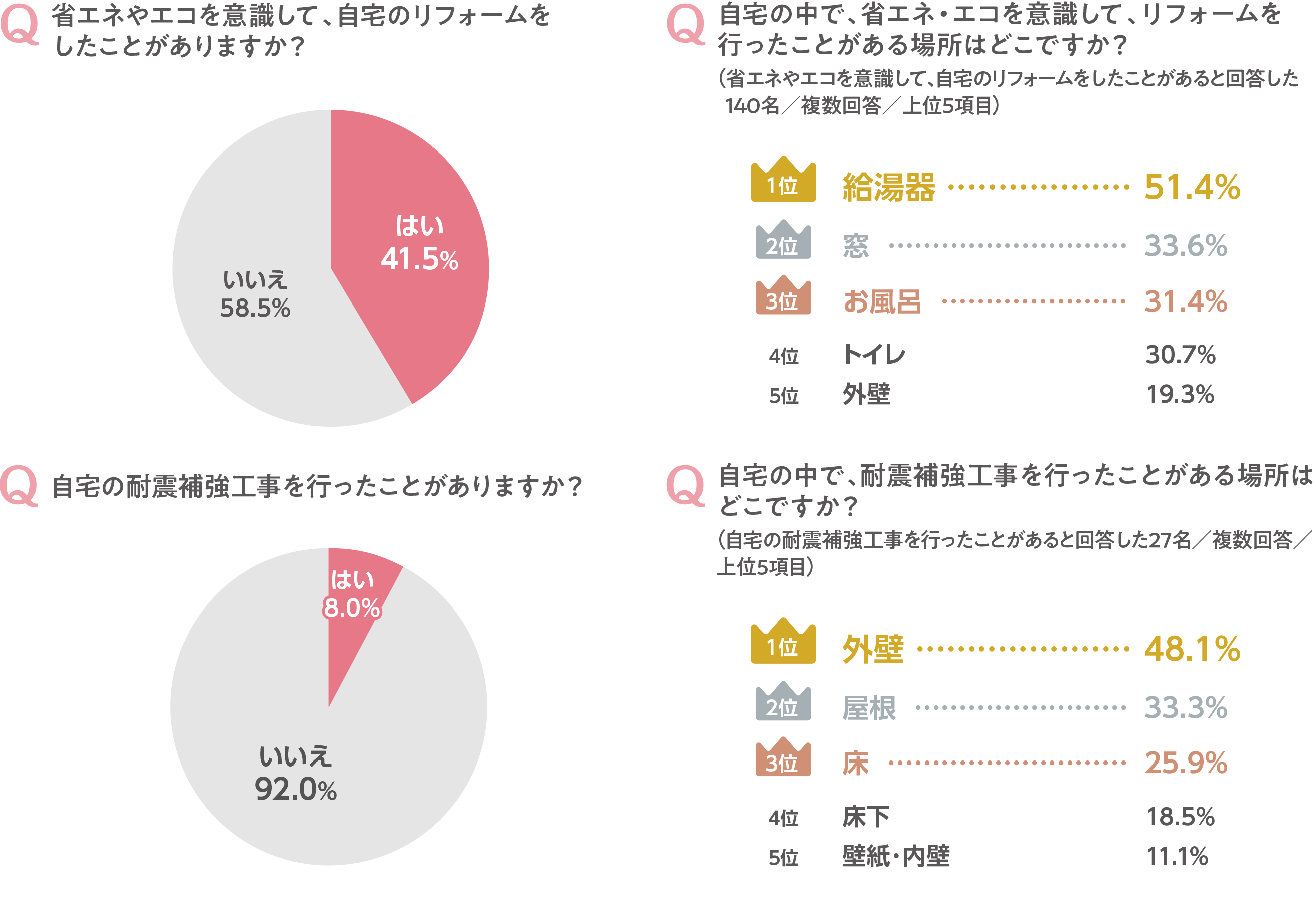 エコリフォームをしたことがある人は41.5%で、エコリフォームをしたことがある場所は「給湯器」「窓」「お風呂」がトップ3でした。また、耐震補強工事を行ったことがある人は8.0%とエコリフォーム経験者と比較して少なく、耐震補強工事を行ったことがある場所は「外壁」「屋根」「床」がトップ3にランクインしました。修繕経験者からは「二重窓は、省エネだけでなく遮音性も向上した」「光熱費が格段に安くなった」などのコメントが寄せられました。