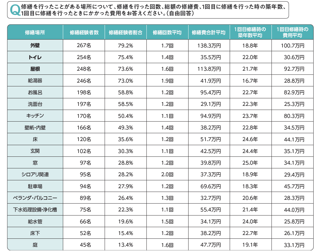修繕を行ったことがある場所を聞いたところ、1位は修繕回数平均1.7回の「外壁」で、修繕費の合計は平均138.3万円でした。次いで、修繕回数平均1.4回の「トイレ」、さらに「屋根」「給湯器」が続きました。修繕経験者からは、「屋根部分の経年劣化の進み方が早く修繕費が結構かかった」「給湯器の耐用年数は考慮した方が良い」などのコメントが寄せられました。