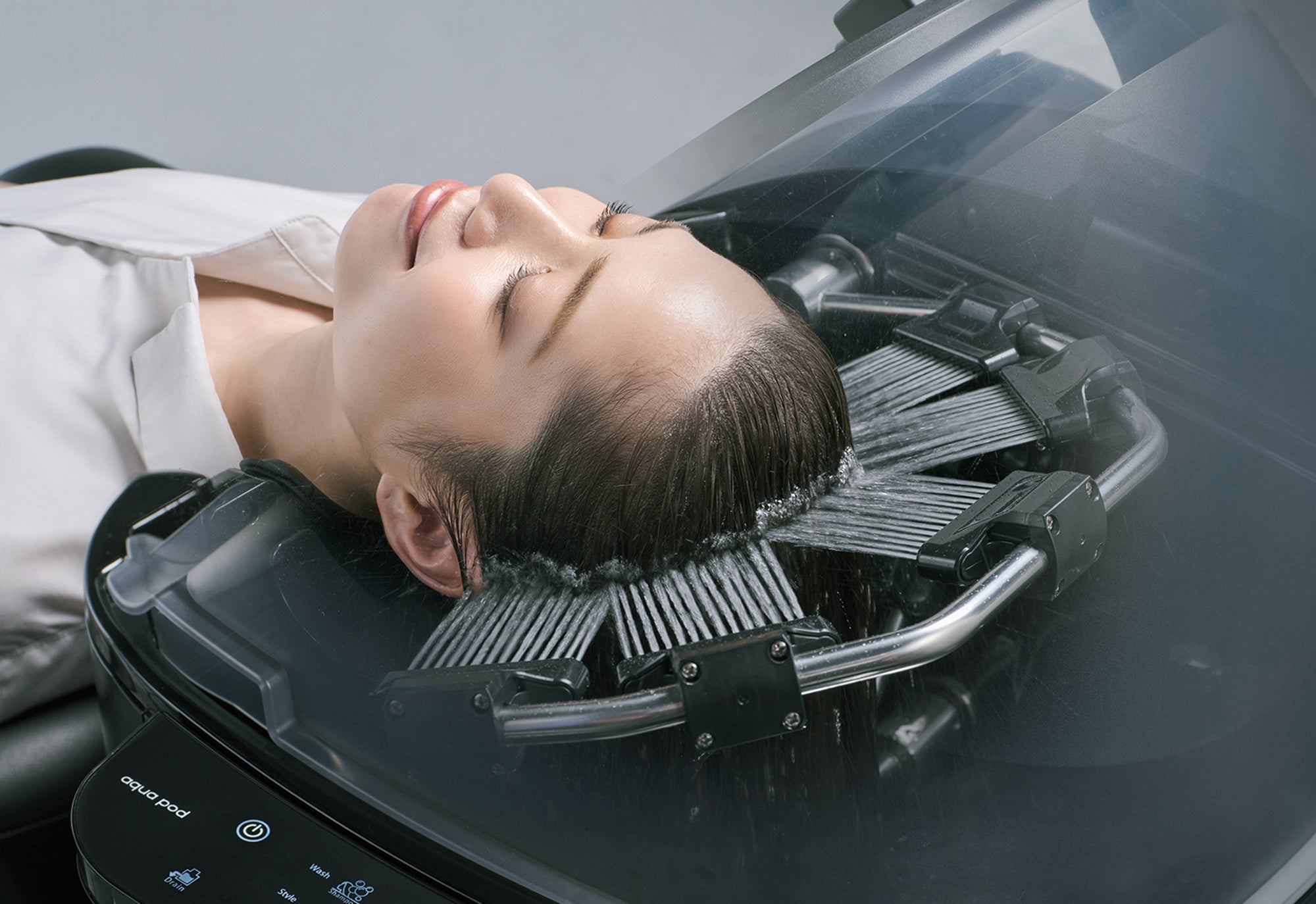 水流が変化する多彩な洗髪プログラムとaqua pod用洗浄美容液の相乗効果により、髪と地肌を潤しながら爽快な洗い心地を提供。