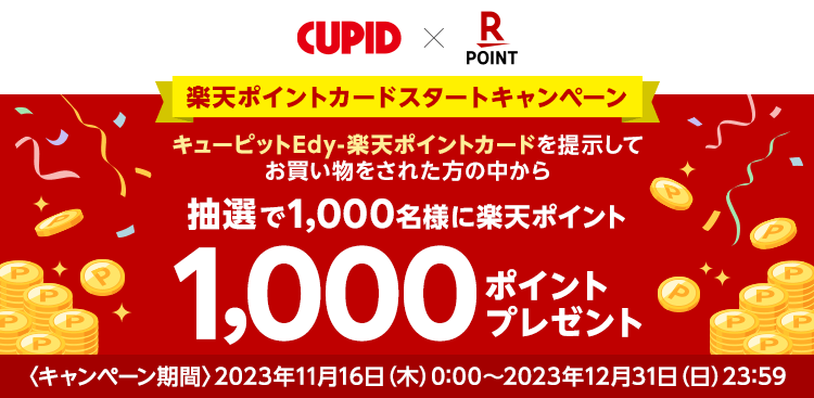 また、本サービス開始を記念して、2023年11月16日(木)から12月31日(日)まで、「楽天ポイントカードスタートキャンペーン!抽選で1,000名様に楽天ポイント1,000ポイントプレゼント!」を実施します。キャンペーン期間中に、「キューピット」対象店舗で「キューピットEdy-楽天ポイントカード」を提示して会計した方の中から抽選で1,000名に「楽天ポイント」1,000ポイントを進呈します。