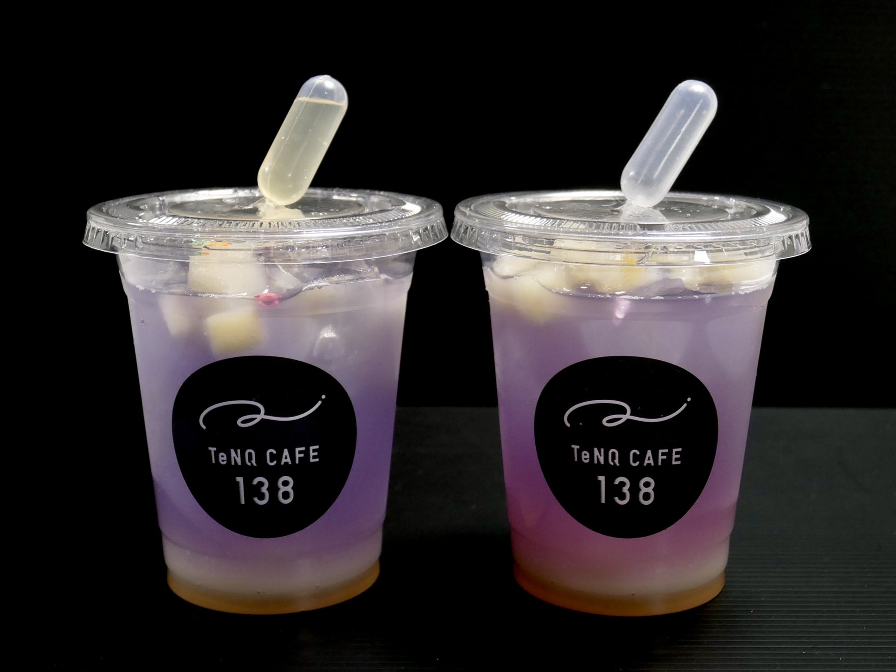 「LOUNGE Q」エリアにある「TeNQ CAFE 138」では、キービジュアルの「オリオン大星雲(M42)」をイメージしたオリジナルドリンクを提供します。爽やかなピーチ味で、お客様ご自身でシロップを加えていただくことで、色の変化もお楽しみいただけます。