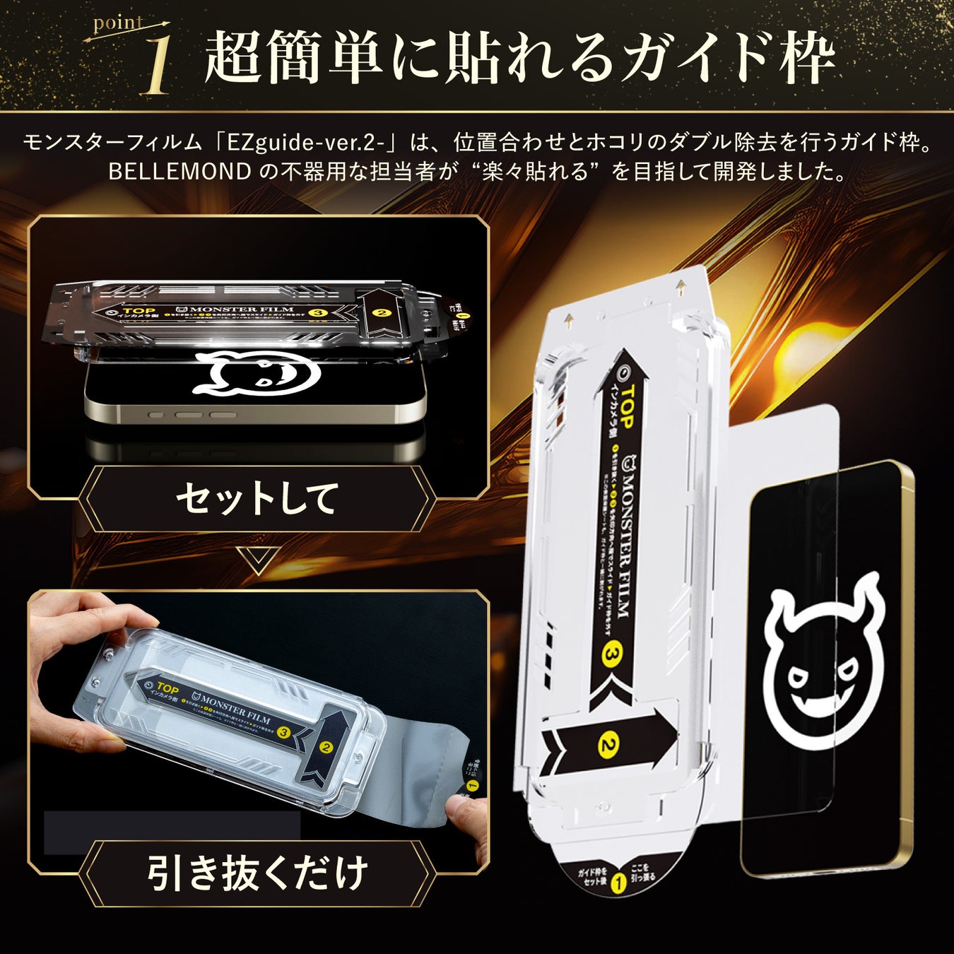 モンスターフィルム「EZguide-ver.2-」は、位置合わせとホコリのダブル除去を行うガイド枠。