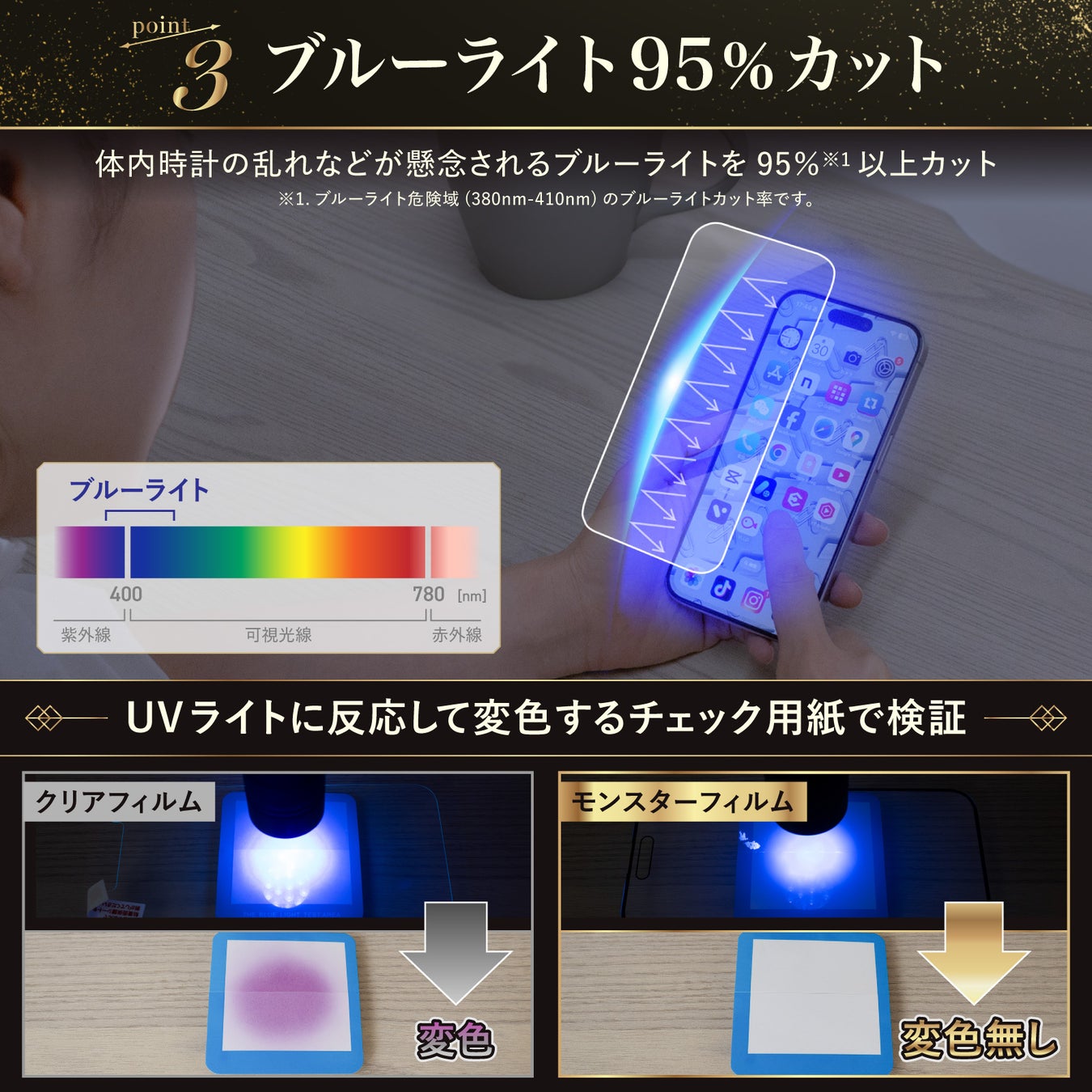 ※1. ブルーライト危険域(380nm-410nm)のカット率