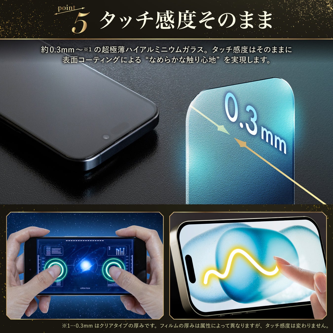 ※1. 0.3mmはクリアタイプの厚みです。フィルムの厚みは種類によって異なりますが、タッチ感度は変わりません。