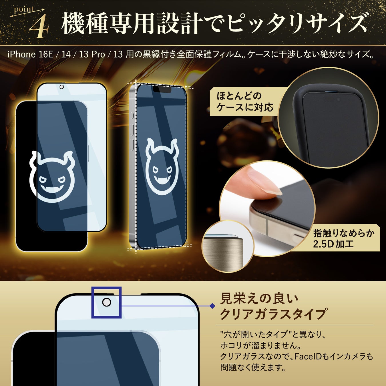 ・iPhone16e専用の黒縁付き全面保護フィルム。ケースに干渉しない絶妙なサイズ設計。
