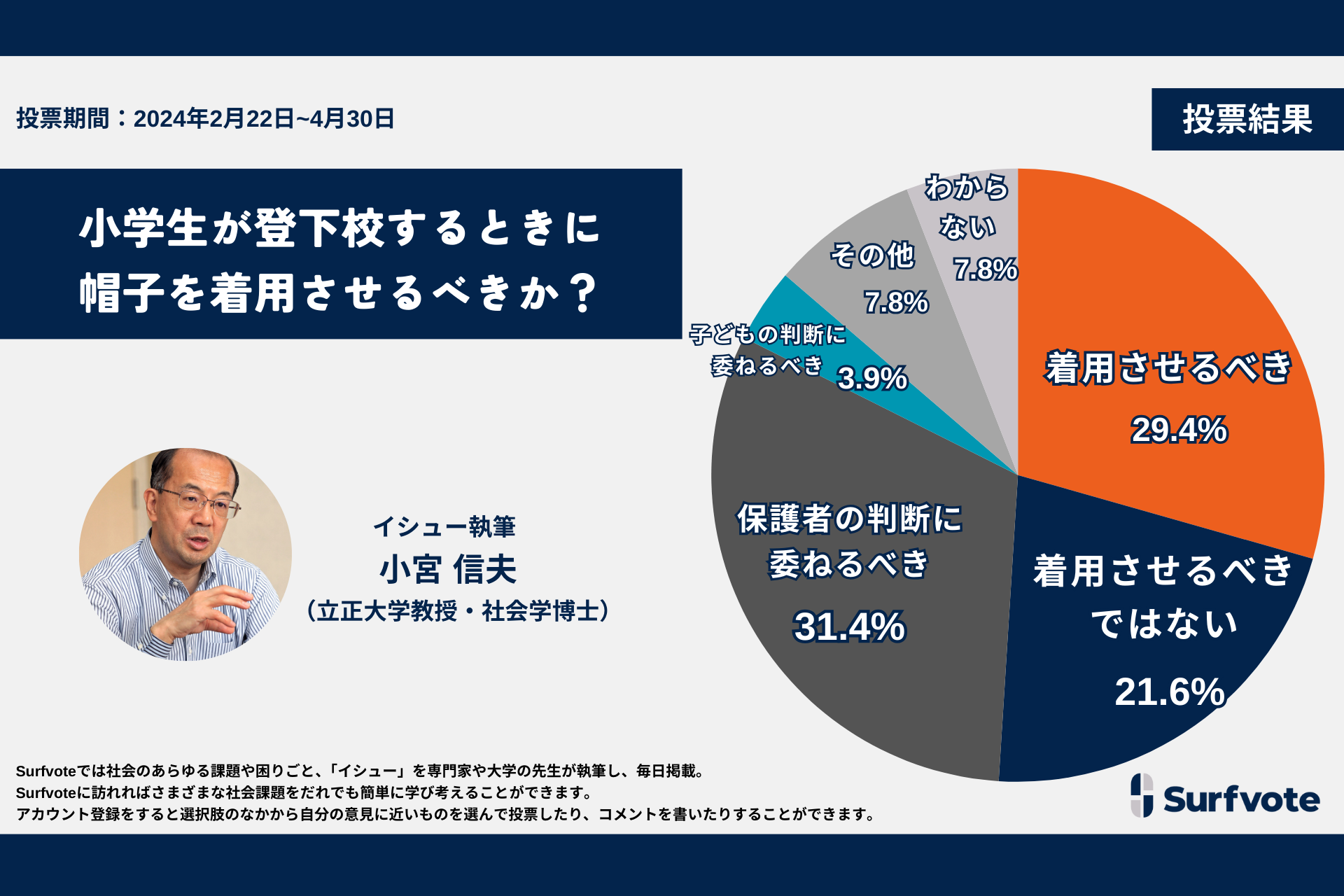 小学生の登下校、帽子を着用させるべきか?Surfvoteの意見投票では約3割が「保護者の判断に委ねるべき」と回答。”保護者と子どもが話し合い各家庭で判断”の意見が多数。