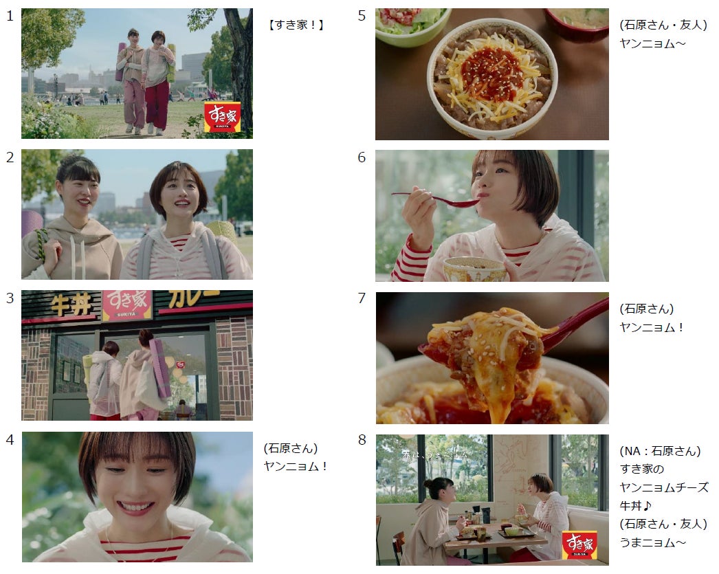 暖かい日差しが心地よい昼下がり、ヨガを終えた石原さんが友人と公園を歩いています。「あっ!」と何かを見つけてテンションが高まる石原さんと友人。駆け寄った先にはすき家があります。商品を見つめワクワクした様子で「ヤンニョム!」、一口頬張りながら再び「ヤンニョム!」と、“ヤンニョム×チーズ”のやみつきになる味わいを表現しています。最後に「うまニョム~」とおいしさを噛みしめる石原さんの表情にも、ぜひご注目ください。
