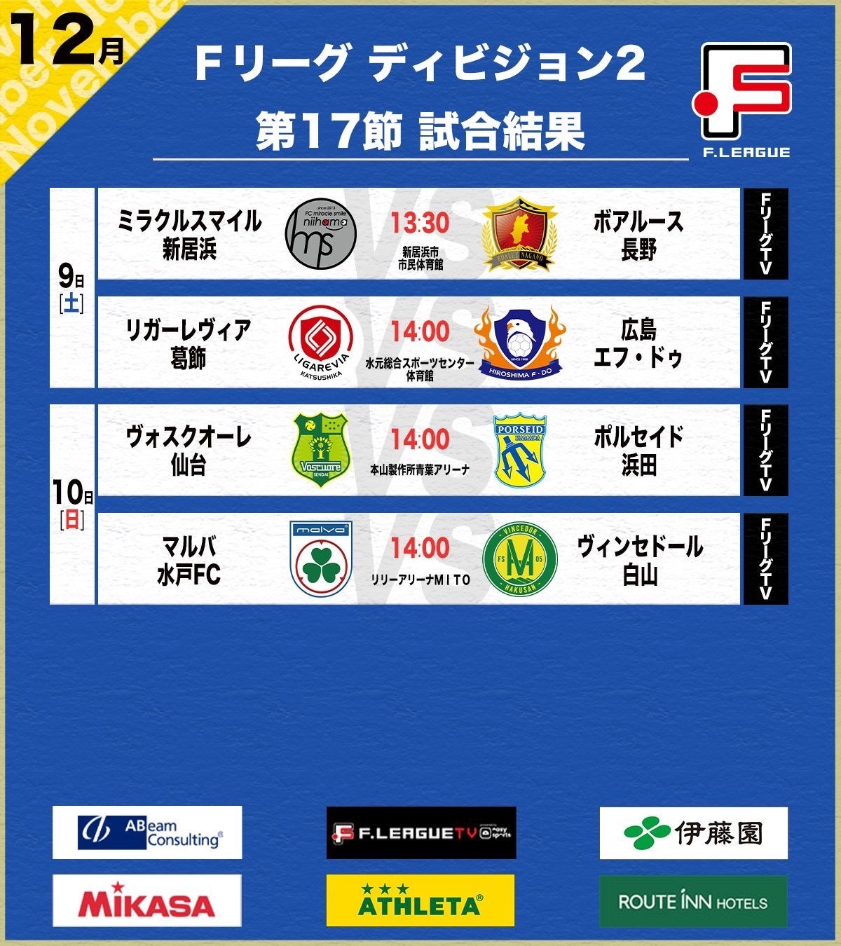 12月9日(土)13:30キックオフ ミラクルスマイル新居浜 vs. ボアルース長野