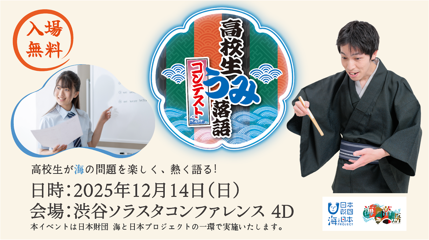 一般社団法人うみ落語協会は、2025年12月14日(日)、東京・渋谷の「渋谷ソラスタコンファレンス」にて「高校生うみ落語コンテスト」 を開催します。本コンテストでは、海洋問題を楽しく、そして分かりやすく伝える「海の落語プロジェクト」に挑戦した10人の高校生が登場。プロの落語家の指導のもと創作・稽古を重ねた「海落語」と、環境科学者の指導のもと実施した調査・研究による「アクティブラーニング」の成果を披露するため、半年間にわたるプログラムの集大成としてステージに臨みます。高校生たちの熱演と学びの成果を、ぜひ会場でお楽しみください。
