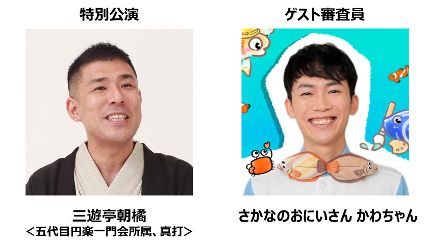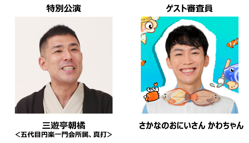 当日は、高校生の落語指導を担当した三遊亭朝橘さんによる特別公演のほか、ゲスト審査員として「さかなのおにいさん かわちゃん」も出演します。