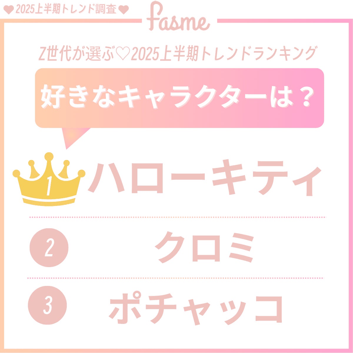 調査の結果、Z世代女子の間で人気を集めたキャラクターTOP3は以下の通りとなりました。