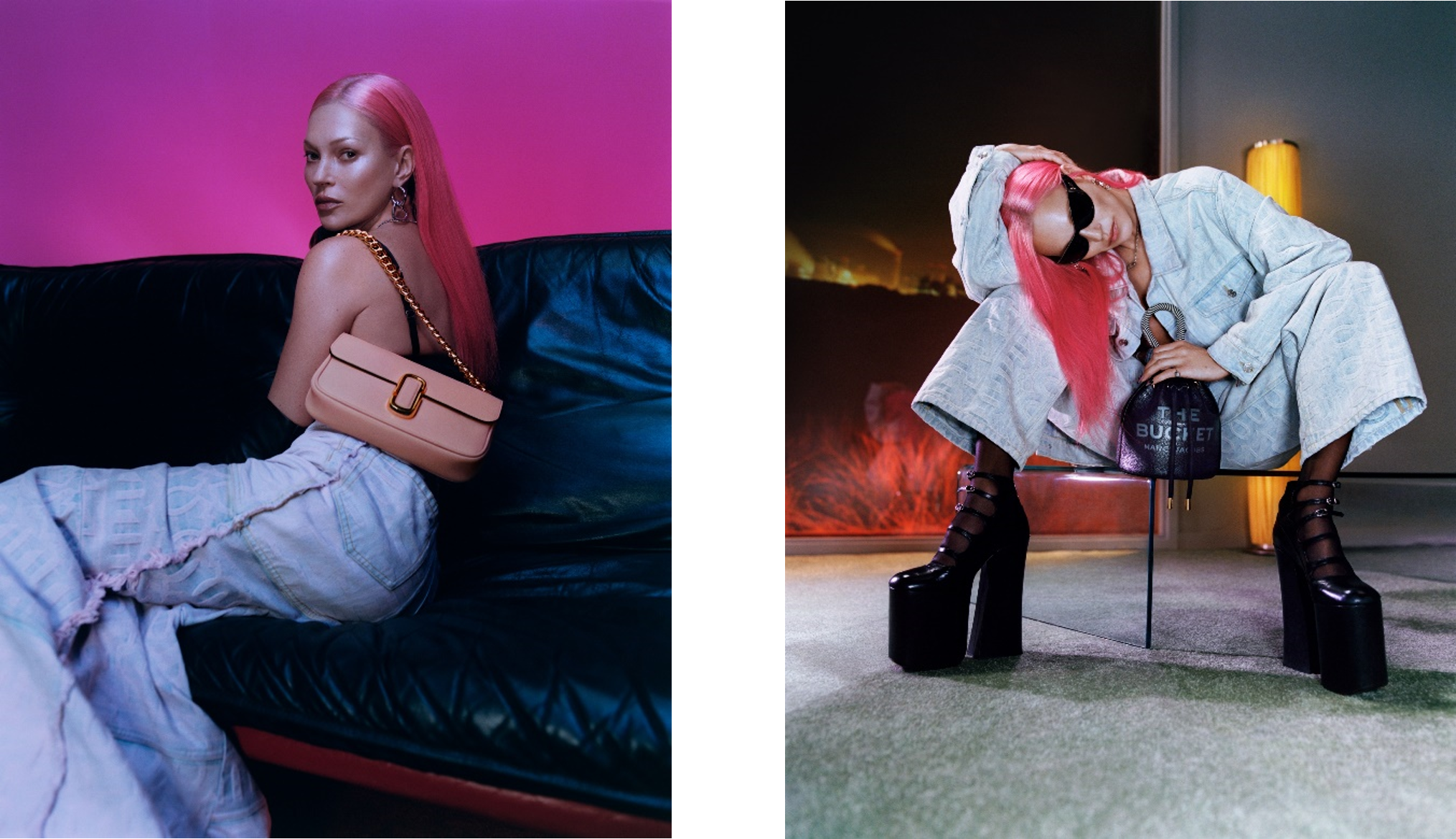 ケイト・モスはマーク ジェイコブスとの歴史が長く、初めて登場した2000年フォールのキャンペーンを彷彿とさせるピンクヘアに染め直し、この度、「THE BUCKET BAG」とアイコニックなランウェイ・ピースのキキブーツを着用した。撮影はハーリー・ウィーアー。スタイリングはダニエル・エマーソン。