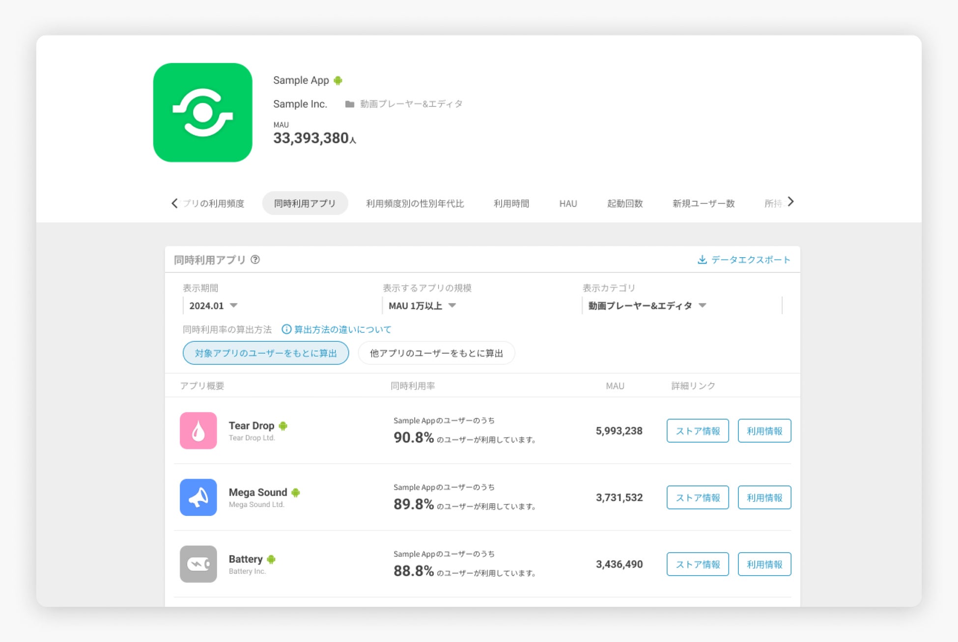 アプリのユーザー動向のデータに加え、アプリストア情報やユーザーの属性情報など横断的なデータを提供しており、市場・競合調査を始めとするアプリの企画・マーケティングに幅広くご利用いただけます。