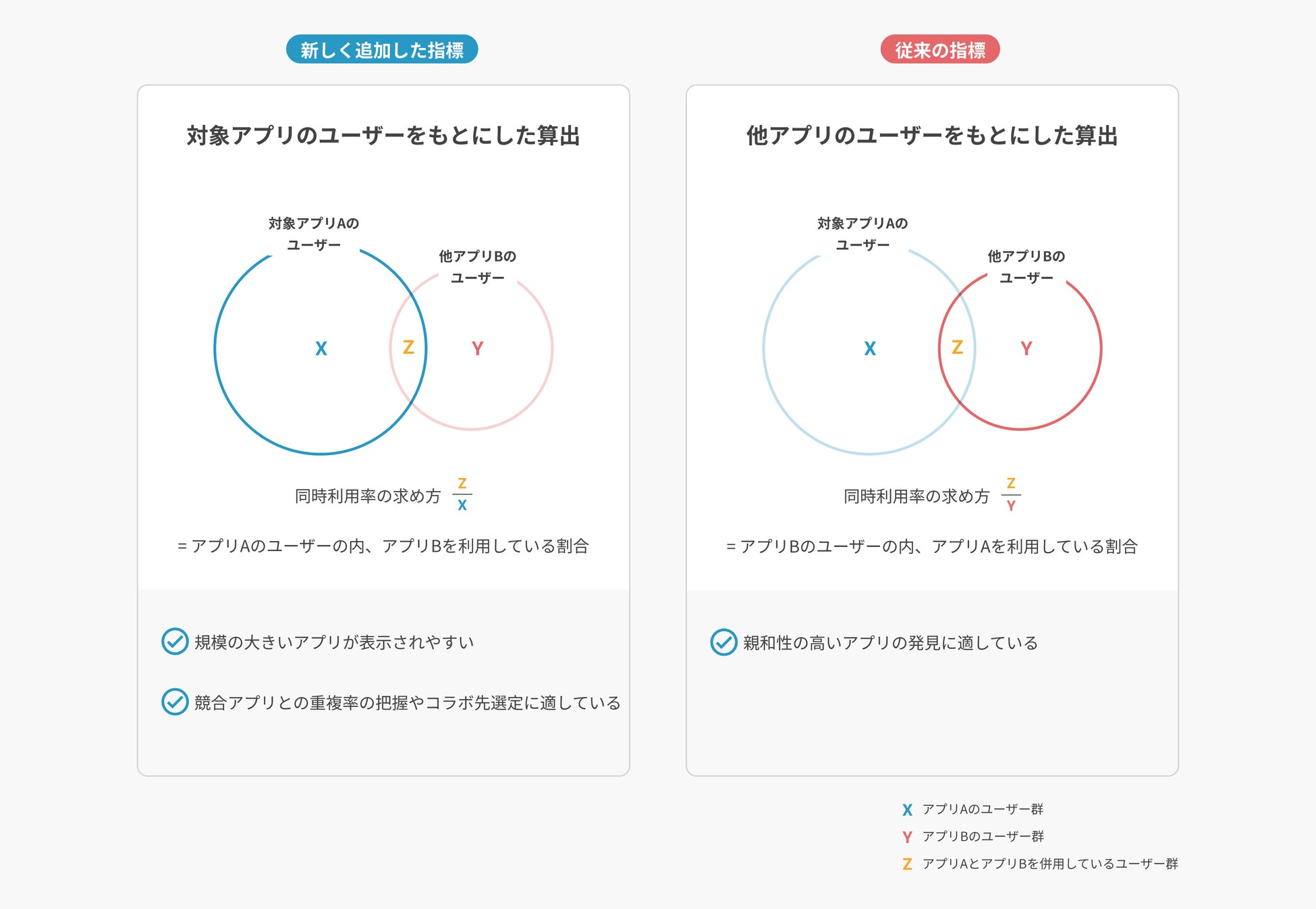 従来の指標では、「他のアプリを利用するユーザーがダッシュボード上で選択したアプリを併用する割合」を算出しており、親和性の高いアプリを探索するのに便利な指標となっています。