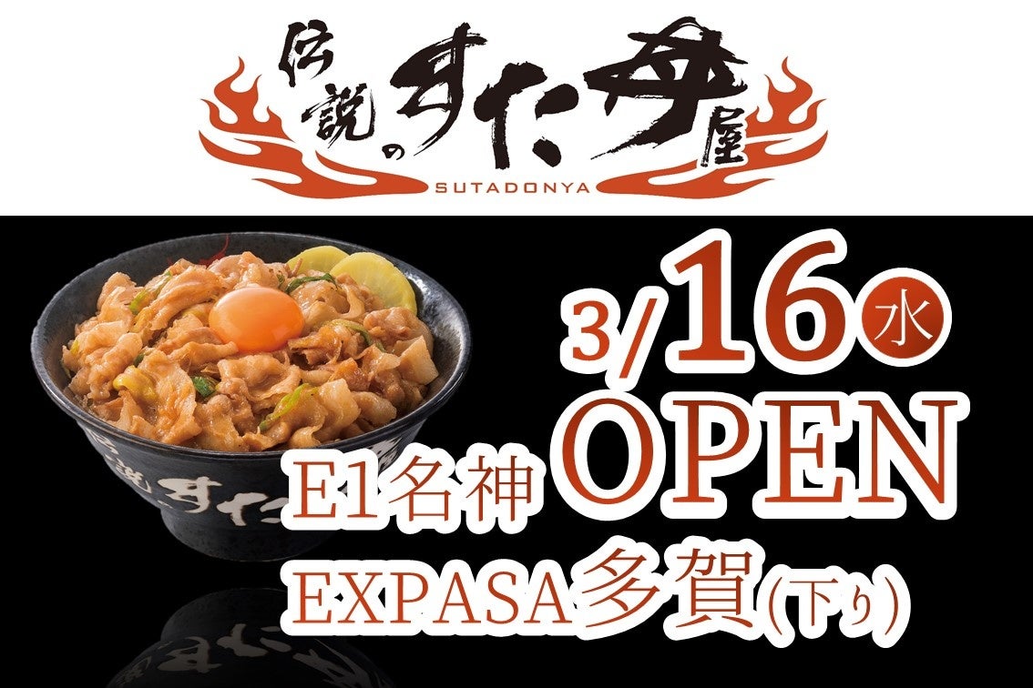 中日本エクシス株式会社 滋賀支店(滋賀県犬上郡多賀町、支店長・橘(たちばな)宏和(ひろかず))は、E1名神高速道路(名神)EXPASA(エクスパーサ)多賀(下り:滋賀県犬上郡多賀町)に『伝説のすた丼屋』を、2022 年3月16日(水)10 時にオープンします。