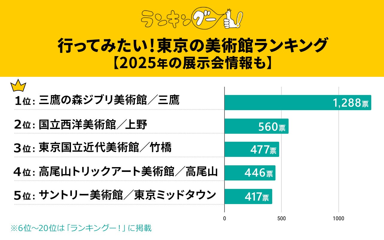 株式会社CMサイト(本社:大阪府大阪市、代表取締役社長:柴原 誠治)が企画編集する、「ちょっと気になる」を調べたランキングサイト『ランキングー!(https://rankingoo.net/)』は、『行ってみたい!東京の美術館ランキング【2025年の展示会情報も】』の結果を、投票者のコメント付きで紹介する記事として公開しました。