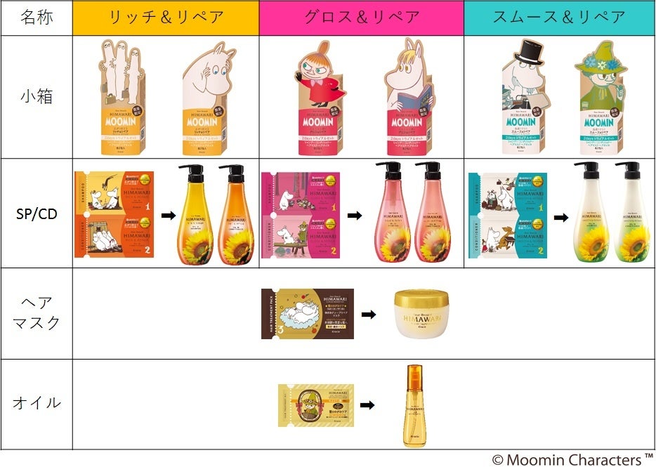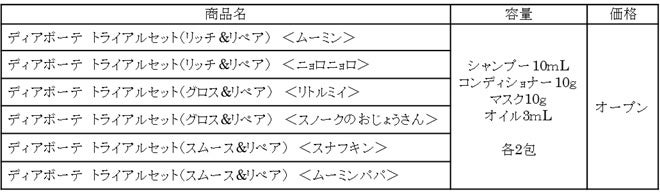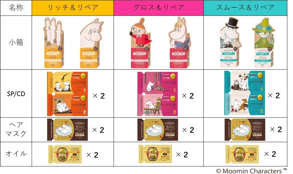 「ディアボーテ HIMAWARI」が「ムーミン」とコラボレーションした限定デザイン商品は、おかげさまで多くのお客様に毎回ご好評いただいております。シャンプー・コンディショナー(以下、SP/CD)3ラインの違いや、トリートメントの「ゆがみディープリペアマスク」と「プレミアムトリートメントオイル(モイスト)」を楽しくお試しいただけるよう、今回はSP/CD3ラインに各2種、計6種のムーミンキャラクターを小箱にデザインしました。小箱には、トライアルサイズが2回分ずつ入っているので、インバスヘアケアからアウトバスヘアケアまで一連使いで「髪のゆがみケア」ができます。また、トライアルサイズは“チケット”に見立てたデザインで、シャンプーからヘアオイルまで1つずつちぎって使い進めて心が弾むヘアケアタイムをお約束します。