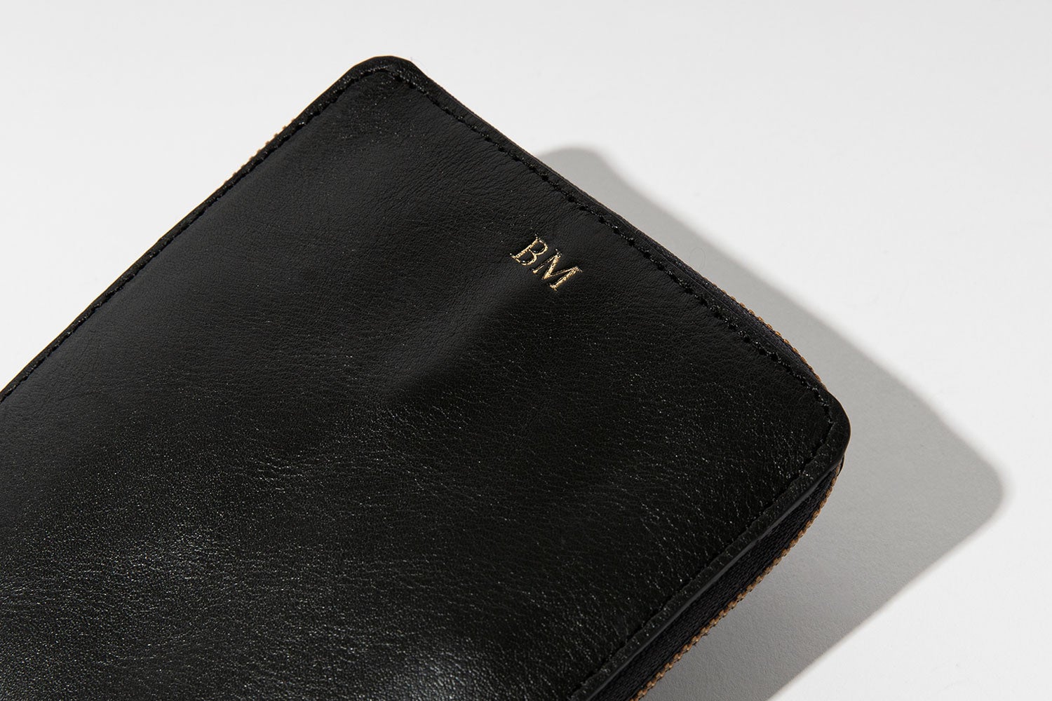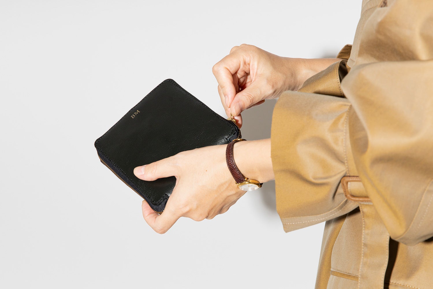 オイルを含み、柔らかく風合い豊かな牛革には、ゴールドのさりげない刻印が。ファスナーにも同じくゴールドをあしらい、バッグから取り出したときにも上品な印象を纏います。
