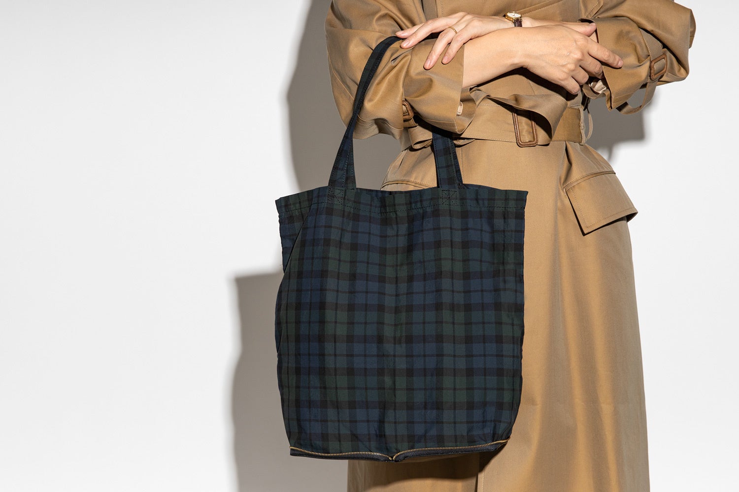 軽量且つA4サイズがゆったり入るサイズ感で使い勝手が良いパッカブルトートバッグ。英国伝統のタータンが、トラッドな気分が高まる秋冬の様々なコーディネートにマッチしてくれます。長さがしっかりとられたハンドルもメインバッグとしても使いやすいポイントです。