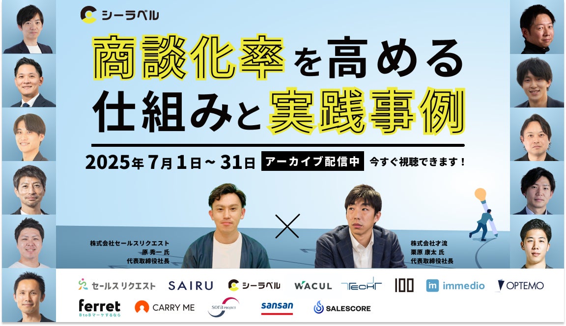 データと知見を核に、戦略から実行までマーケティングDXを一気通貫で支援する株式会社WACUL(本社:東京都千代田区、代表取締役社長:大淵 亮平、証券コード:4173、読み:ワカル、以下当社)は、6/24(火)に登壇しご好評をいただいた株式会社シーラベル(本社:神奈川県横浜市、代表取締役:渡辺敬吾、以下「シーラベル」)主催のセミナー【商談化率を高める仕組みと実践事例】が7月1日より1カ月間、アーカイブ配信を開始することをお知らせします。