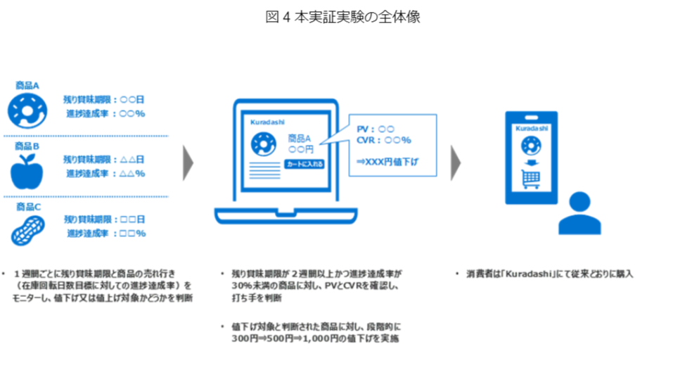 株式会社日本総合研究所(以下「日本総研」)および株式会社クラダシ(以下「クラダシ」)は、ダイナミックプライシングの導入による売り切り促進の効果を検証する実証実験(以下「本実証実験」)を、ソーシャルグッドマーケット「Kuradashi(注1)」において行いました。また、本実証実験に先立ち、Kuradashiへの出品経験のある事業者を対象に、 食品ロスの発生要因や削減への取り組みについてのアンケート調査(以下「本アンケート調査」)を実施しましたので、その結果と併せて発表します。本実証実験は、経済産業省委託事業「令和4年度 流通・物流の効率化・付加価値創出に係る基盤構築事業(IoT技術を活用したサプライチェーンの効率化及び食品ロス削減の事例創出)」(注2)に採択され、2022年11月1日(火)から2023年1月31日(火)の期間で実施しました。