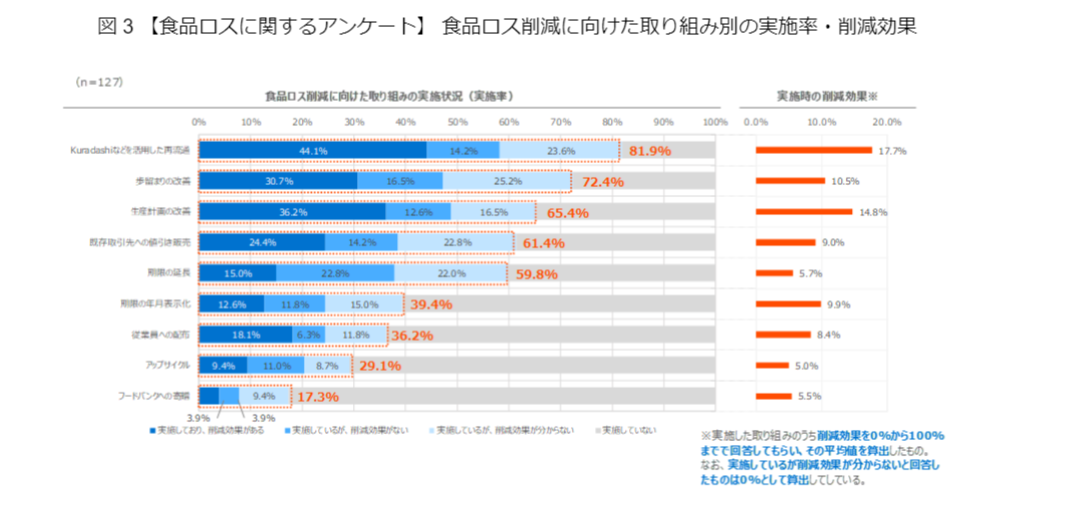 食品ロス削減に向けた取り組みのうち、「Kuradashiなどを活用した再流通」「歩留まりの改善」「生産計画の改善」「既存取引先への値引き販売」「消費期限の延長」の5つの実施率が50%を超えました(図3)(注4)。