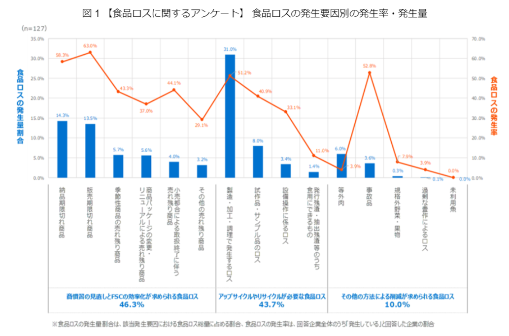 最多の46.3%を占めたのは、「商慣習の見直しとFSCの効率化が求められる食品ロス」で、納品・販売期限切れ商品や売れ残り商品などが該当します。3分の1ルールといった商慣習を官民連携で見直したり、IoT技術などを活用した高度な需給予測による効率的なサプライチェーンを導入したりすることで削減が可能と考えられます。