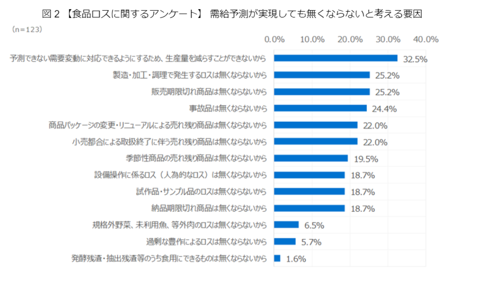 また、需給予測の高度化が進んでも食品ロスがなくならない要因として、32.5%が「予測できない需要変動に対応するために、生産量を減らすことができない」を挙げました(図2)。こうして発生した余剰食品も、余剰食品プラットフォームでの販売で削減できると考えられます。