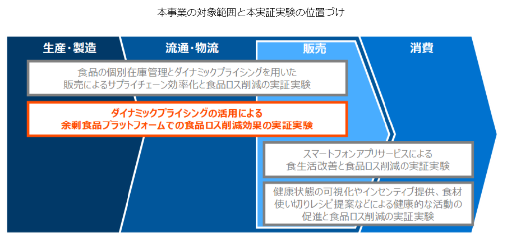 その一つである本実証実験は、サプライチェーンの効率化および事業系食品ロスの削減を目的に、生産・製造から流通・物流、そして販売までのプロセスを対象として実施します。