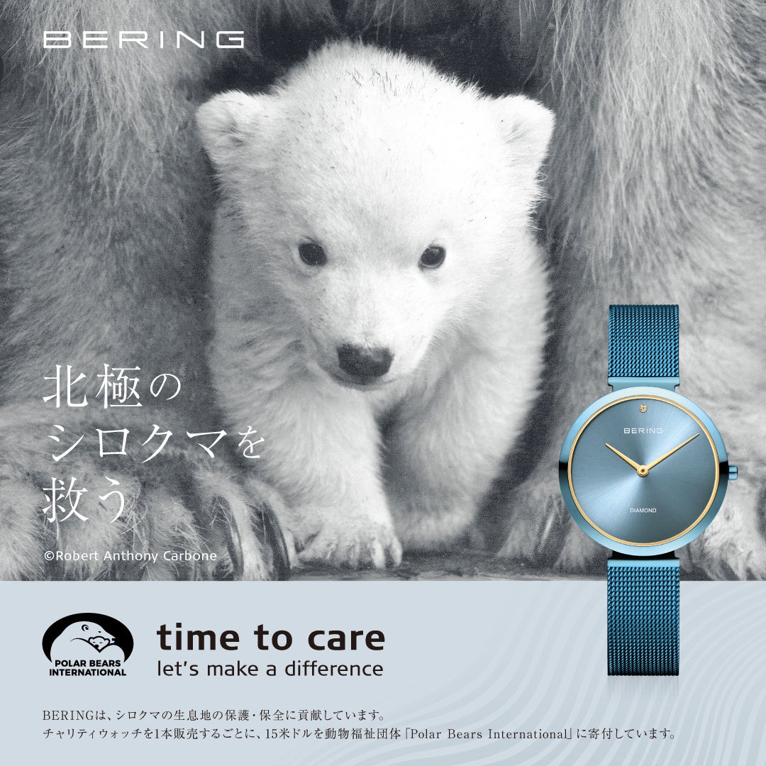 BERINGは2011年からシロクマおよび彼らの生態環境の保護に力を入れ、定期的にチャリティーモデル「time to care」を発売し、1本の時計から$15を動物福祉団体「Polar Bears International(PBI)」へ寄付を行っています。