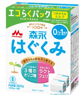 「森永はぐくみ」は、母乳の栄養バランスをお手本に、初乳に多いラクトフェリン、3種類のオリゴ糖などを配合し、赤ちゃんのおなかを考えたミルクです。「エコらくパック」はママの声から生まれた日本で唯一(*)の「つめかえ」タイプ。ミルクが入った袋を専用ケースに簡単に詰め替えられます。コンパクトで場所を取らないので収納にも便利です。ご使用の際は、まずは「はじめてセット」をご用意ください。