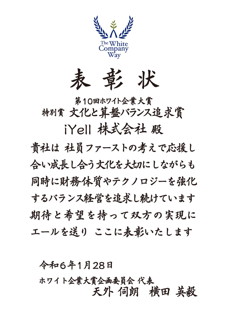 iYell株式会社、第10回ホワイト企業大賞にて特別賞を受賞