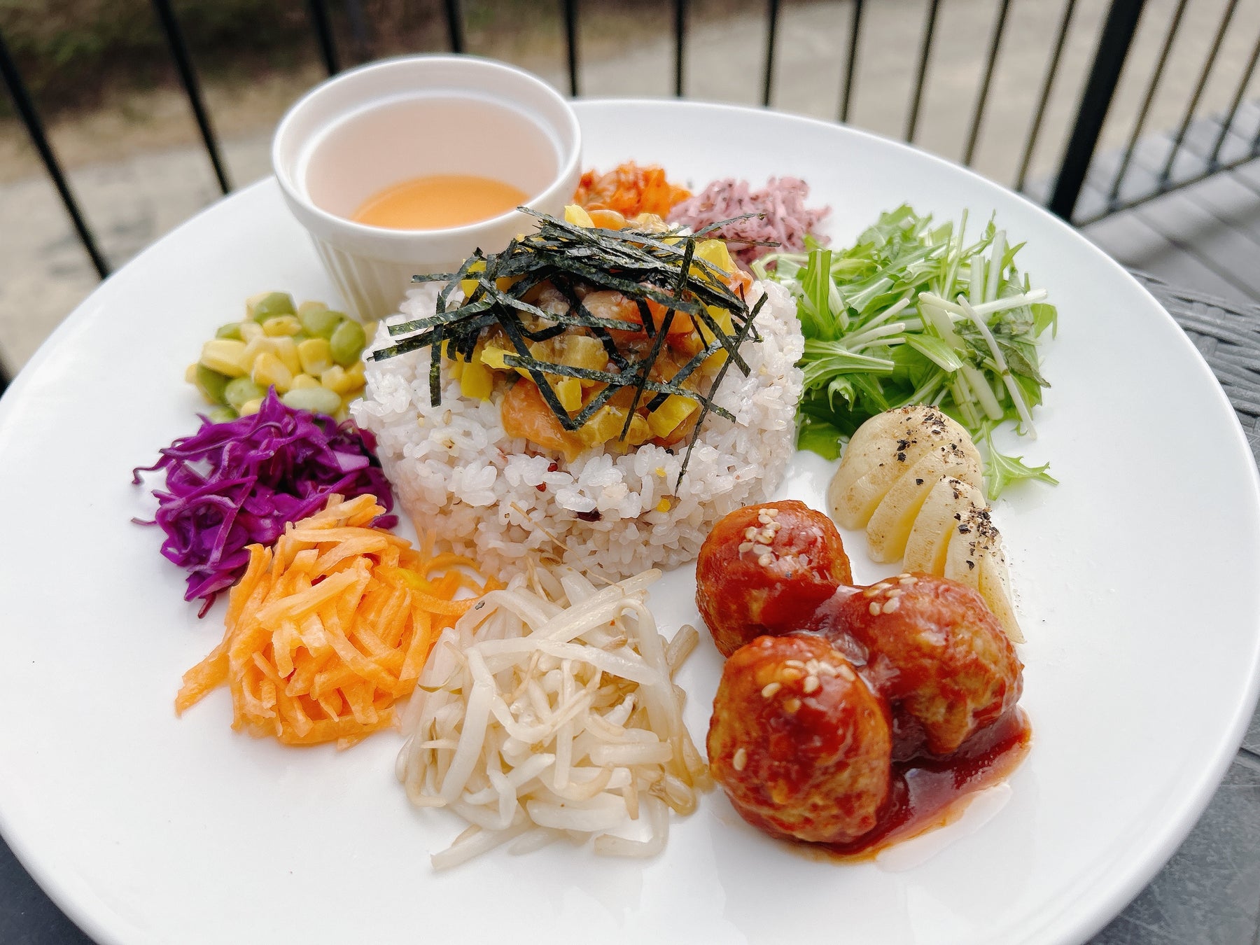 フレンチシェフによる見た目も鮮やかな「カラフルごはんプレート1,850円(税込)」や暑い日にぴったりな「野菜たっぷり冷麺1,200円(税込)」など、季節に応じて様々な“カフェごはん”を提供。沖縄で有名なアイスクリームや100%ザクロジュース など、デザート・ドリンク各種も取り揃えています。