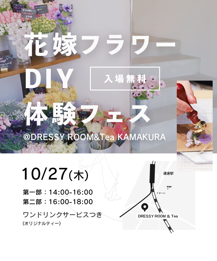 【DRESSY ROOM&Tea】10/27(木)鎌倉でオリジナルブーケやウェディングアイテムがつくれるDIYイベント『花嫁フラワーDIY体験フェス』開催決定!!