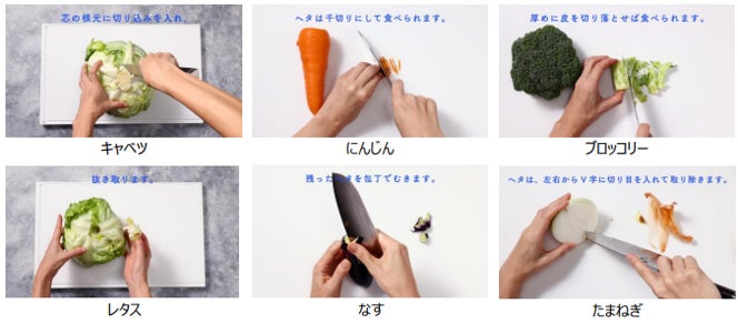 「やさしい切りかた辞典™」で切り方を紹介するのは家庭でも廃棄の量が多い15種類の野菜や果物。さらに6種類の野菜については、つい捨ててしまいがちな野菜の部位を使用したオリジナルレシピを紹介しています。