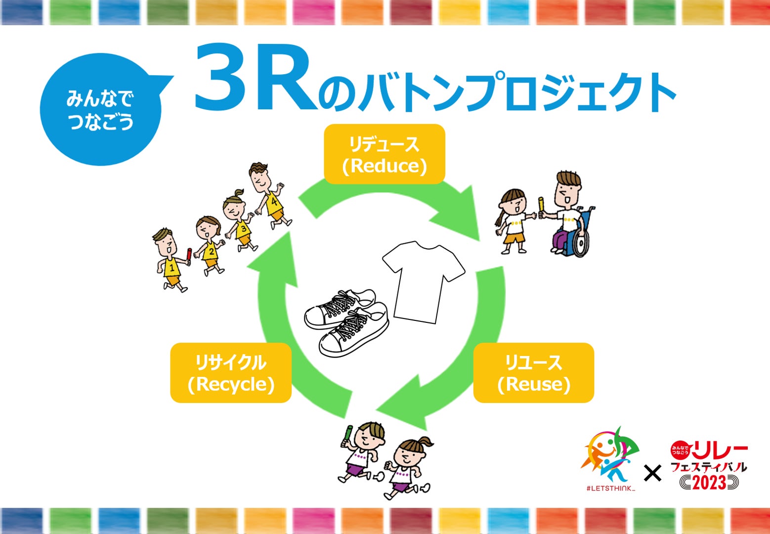 3Rとは【Reduce(リデュース)ごみを削減する】・【Reuse(リユース)再使用する】・【Recycle(リサイクル)資源化】を意味し、本企画では、リレフェスを観にいらした方やリレフェスに出場される皆さまに「まだ使えるけどサイズアウトしてしまったスポーツウェア」、「現役時代に使ったスパイク」、「履かなくなった運動靴」など、皆さまの思い出の品でまだまだ使える、使ってもらいたい衣料品(運動靴、スパイク等を含む。)や、ヨレ・ほつれ・洗っても落ちないシミなどがあって廃棄しようと思っていたスポーツウェアを3Rのバトンプロジェクトブースに持ち寄っていただき、次の未来につなげることで、衣類ロスと廃棄物の焼却に伴うCO2排出量の削減に貢献してまいります。
