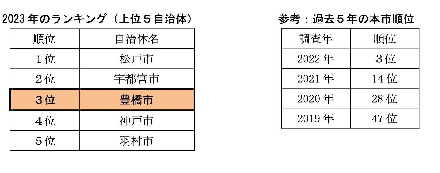 2023 年のランキング(上位5自治体) 参考:過去5年の豊橋市順位