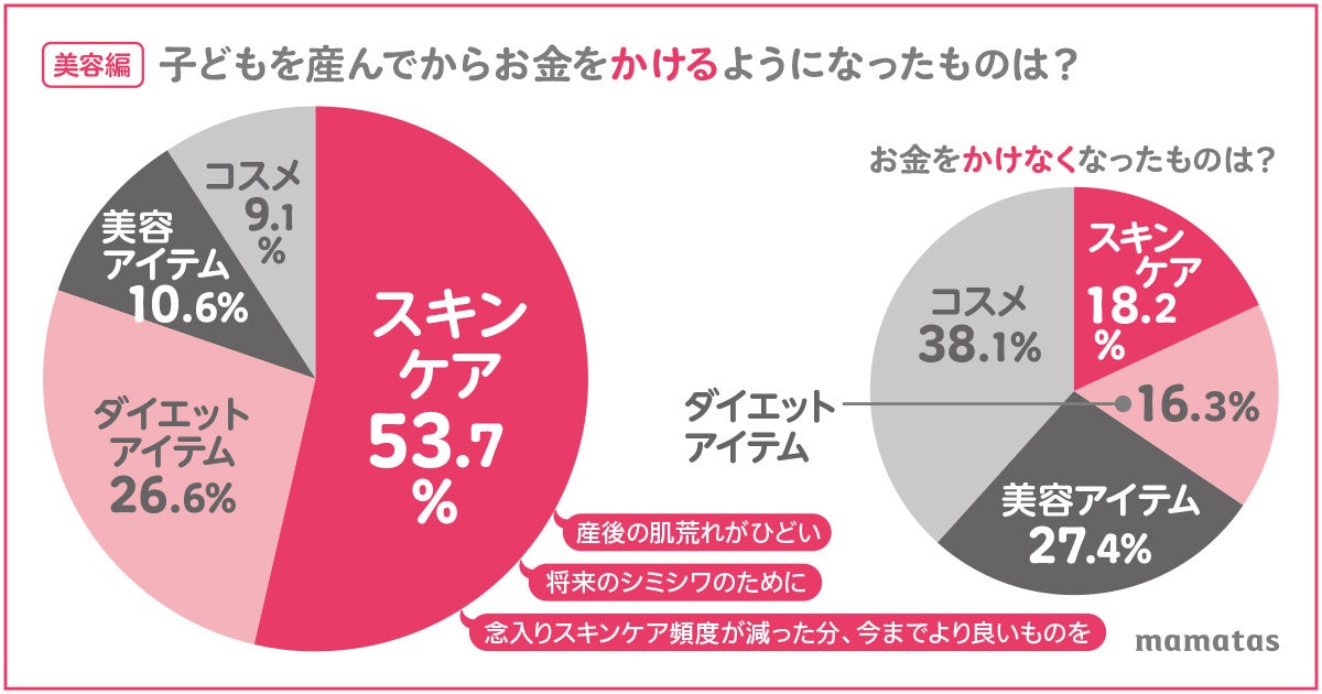 - 「美容アイテム」のなかでは「スキンケア」にお金をかけるようになったと答えたママが53.7%