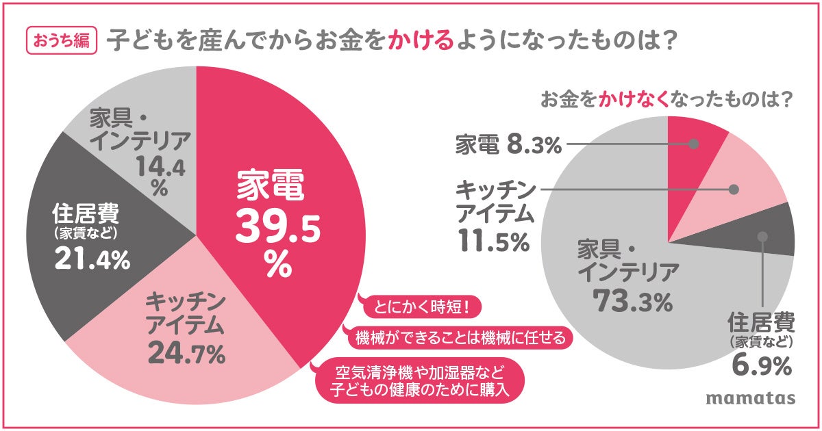 2位の「キッチンアイテム」(24.7%)の理由には、「時短アイテムなど料理が手軽にできるものを買うようになった」など、家事負担を少しでも軽減したいという令和ママの強い思いが見受けられました。