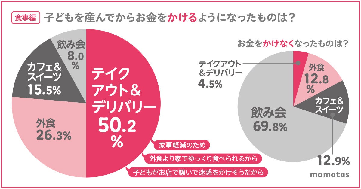 「テイクアウト&デリバリー」にお金をかけるようになった理由としては、「時間と手間を短縮」「ごはんを作るストレス軽減」「旦那がいない時はキッチンに立たない」「休みたい!」。子どもが小さいうちは外食だと周りの目が気になる人も多く「テイクアウトは外食よりゆっくり食べられるから」という回答も目立ちました。