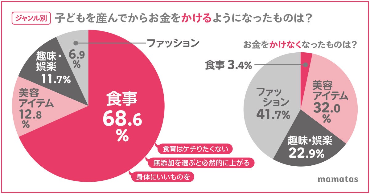 - ママの68.6%が「ママになってから食べるものにお金をかけるようになった」と回答。「お金をかけなくなったもの」は「ファッション関連」の回答が最も多く、41.7%