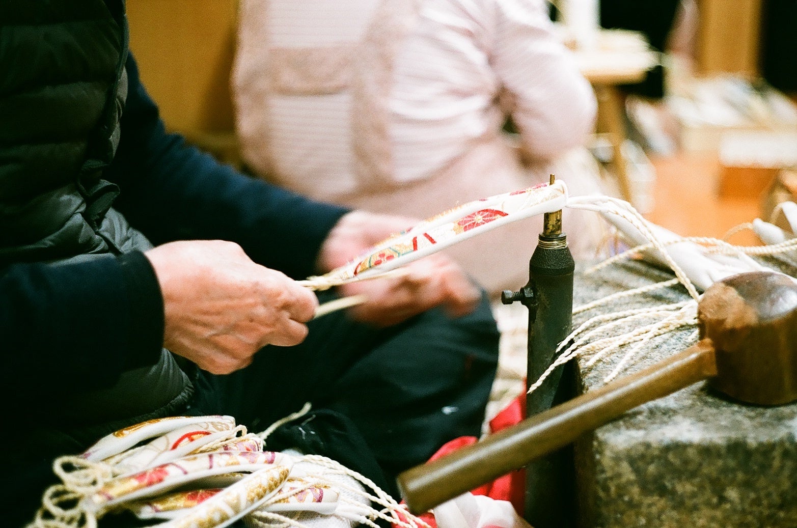 ・日本の染織物を用いて制作した多種多様の花緒から自由に選ぶことができる。
