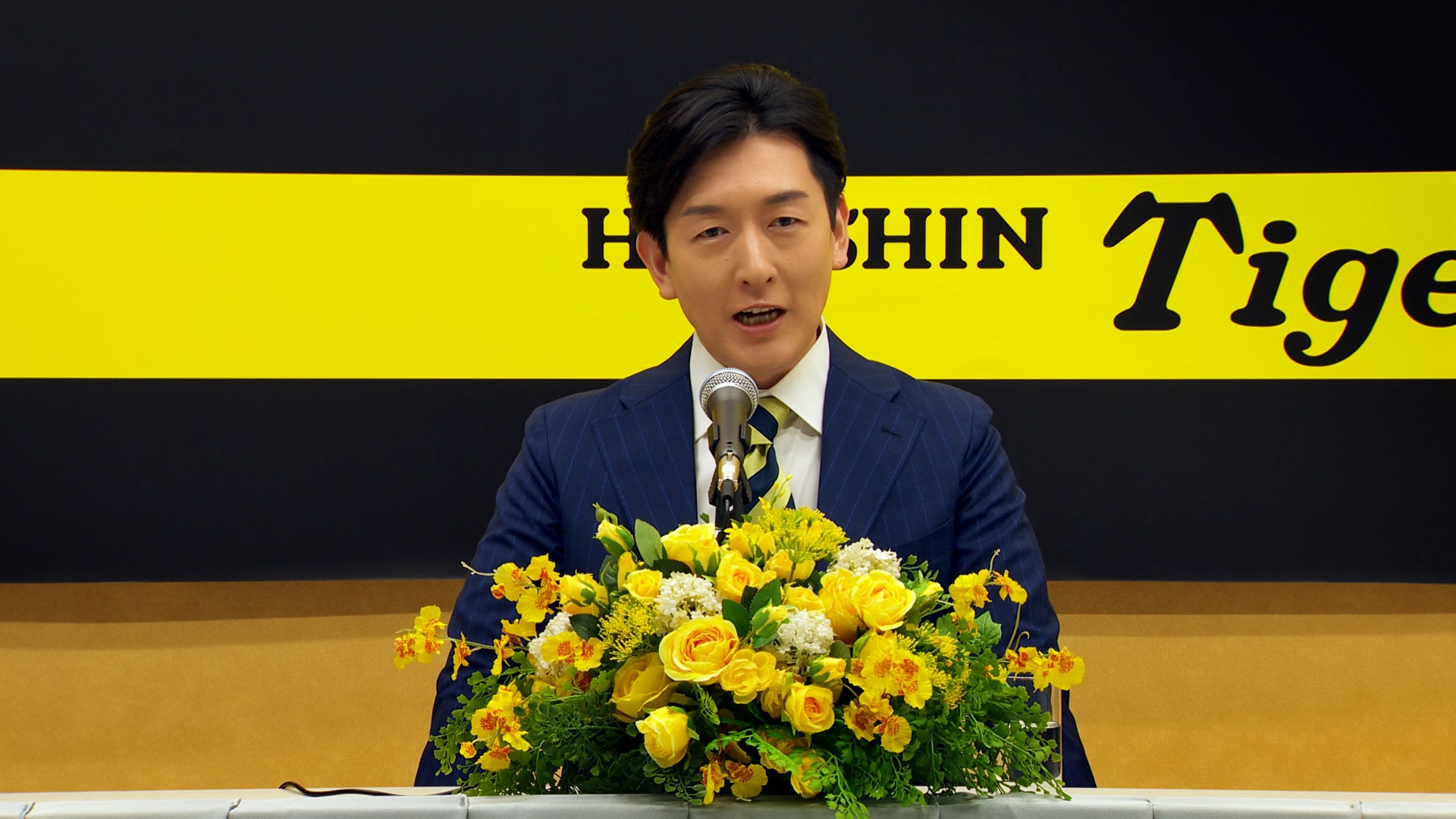 今回制作したCM動画は、記者会見のようなシチュエーションに、阪神タイガースファンである主人公が登場し、記者に向けて阪神タイガースキャッシュカードのデザインを見せながら、カードの魅力をアピールするという内容になっています。