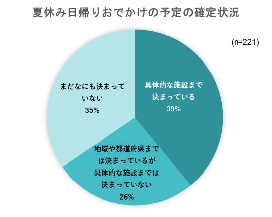 そのなかで「具体的な施設まで決まっている」という人は4割程度にとどまり、「地域や都道府県までは決まっているが具体的な施設までは決まっていない」「まだなにもきまっていない」と回答した人が合わせて6割以上いました。日帰りおでかけについては「これから具体的に考える」という人が多く見受けられます。
